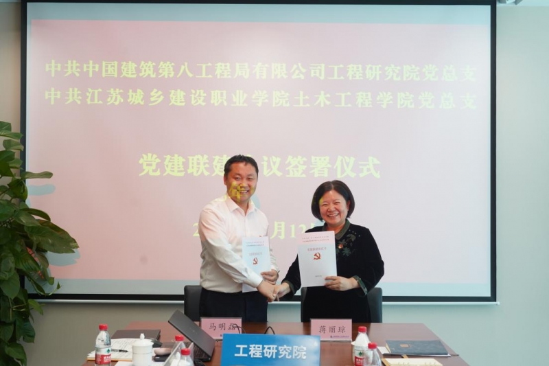 中建八局工程研究公司党总支书记马明磊与公司党总支书记蒋丽琼签署党建联建协议。