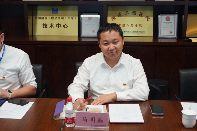 马明磊经理致辞,代表研究院对公司一行表示热烈欢迎,介绍了中建八局“军魂匠心、家国情怀、令行禁止、使命必达”的铁军文化,并表示要与公司双向赋能、党建共建,深化产教融合,打造“产学研用”闭环创新链。