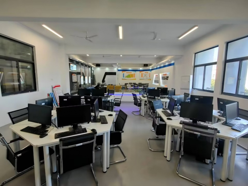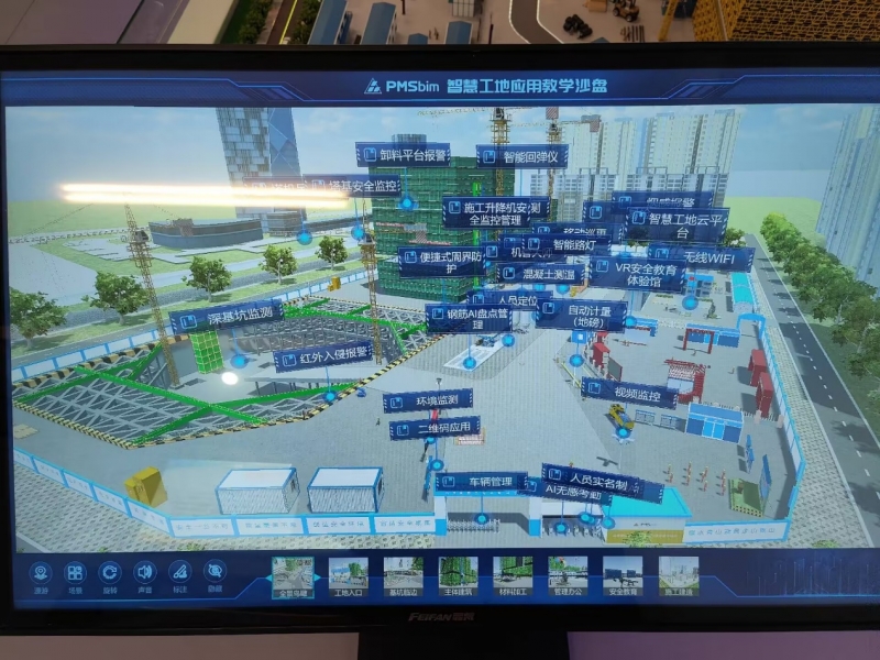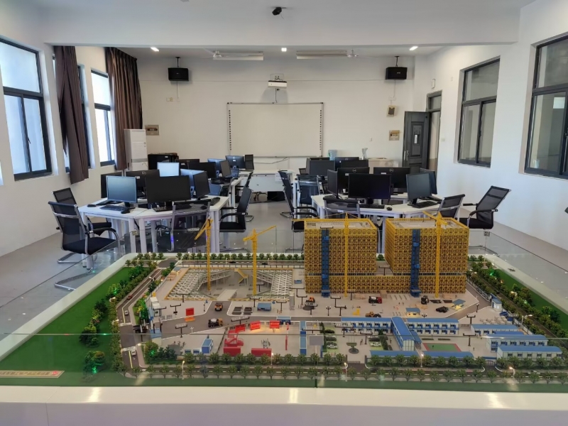 智慧工地实训室,面积145m2,主要依托智慧工地虚实一体教学数字沙盘、固态沙盘模型、虚拟仿真教学实训平台,开展智慧工地实认知教学和实践教学。